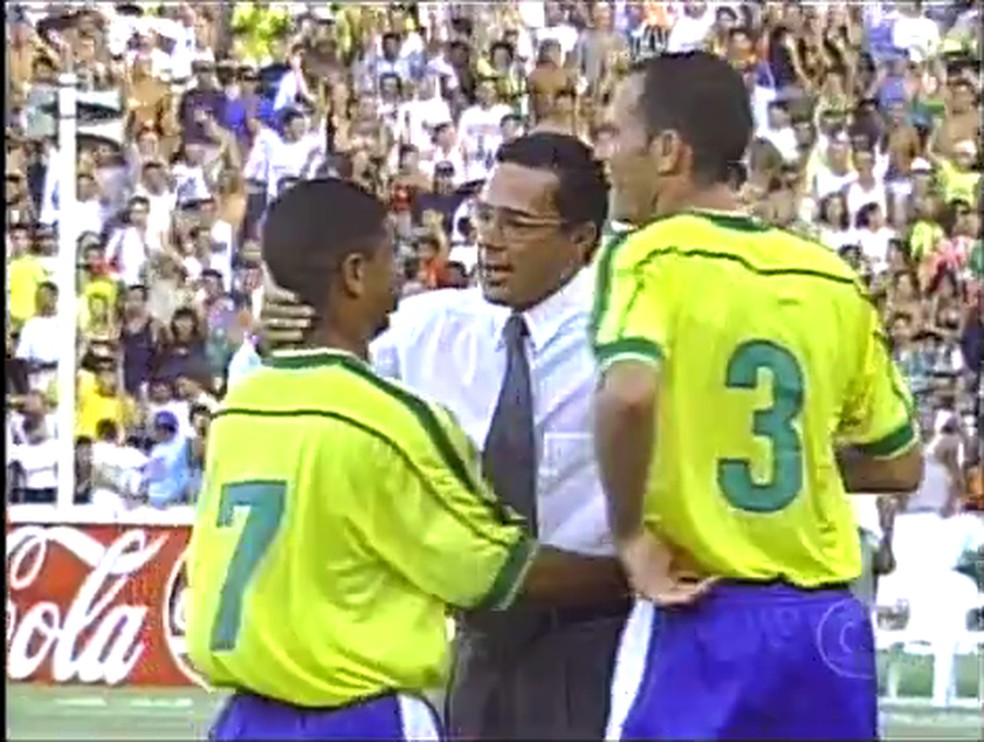 Marcelinho Carioca com Luxemburgo na seleção em 1998 — Foto: Reprodução da TV