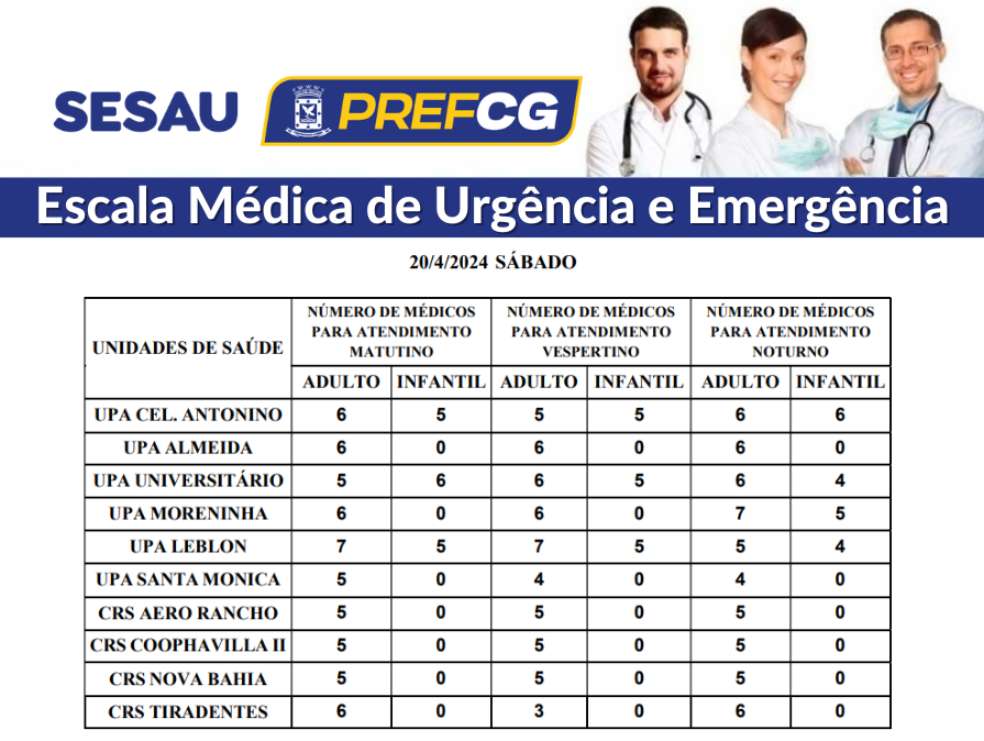 Confira a escala médica de plantão nas UPAs e CRSs neste sábado, dia 20 de abril de 2024.