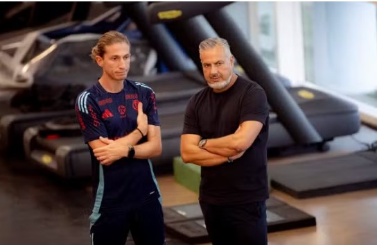 Filipe Luís e José Boto no CT do Flamengo — Foto: Adriano Fontes / Flamengo