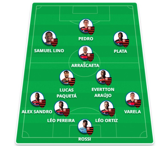 Provável escalação do Flamengo: Rossi; Varela, Léo Ortiz, Léo Pereira (Vitão), Alex Sandro; Evertton Araújo, Paquetá, Arrascaeta; Plata (Luiz Araújo), Lino e Pedro.